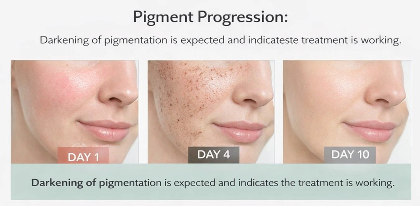 Pigmented areas such as freckles, sun spots or age spots may darken over the first few days. This is an expected response and indicates the pigment is being targeted. These areas will gradually fade or shed over 7 to 14 days. Do not pick or exfoliate these areas.